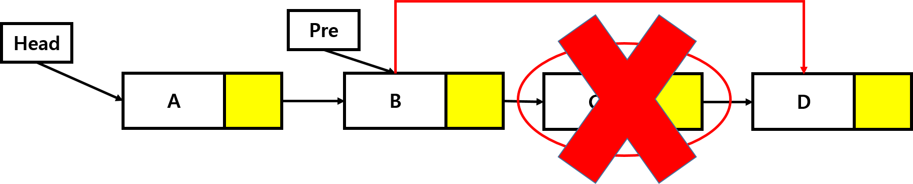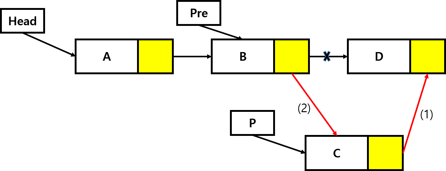 pre->link = removed->link; // 선행노드와 삭제할 노드의 다음노드와 연결