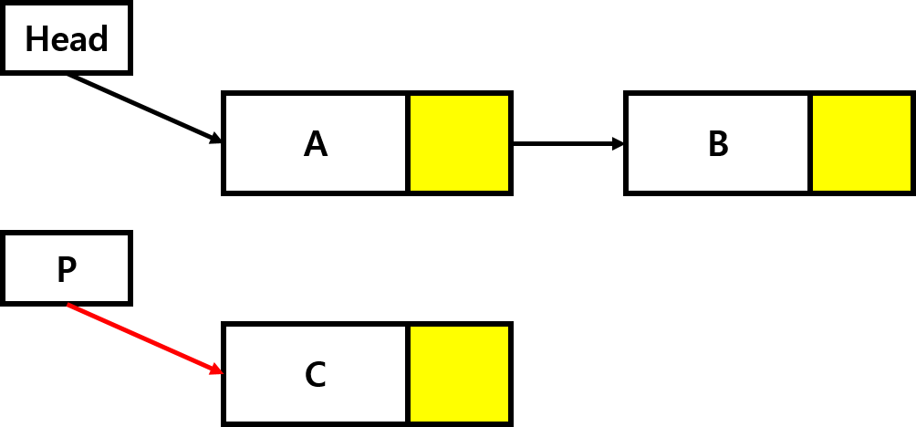 위 그림처럼 특정 리스트가 있고 추가할 새로운 노드가 있는 상황이 있다고 가정해보겠다. 노드 C를 리스트 맨 앞에 넣기 위해서는 어떻게 해야 할까?? 먼저 동적 메모리 할당으로 C에 해당하는 노드를 생성한 뒤 C의 링크부분이 A를 향하게 한뒤 헤드 포인터가 C를 향하게 하면 된다. 그림으로 천천히 보자.