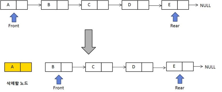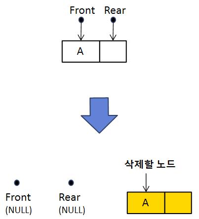 노드가 하나인 경우에는 front, rear 모두 다시 NULL 값을 가지는 공백 상태가 된다.